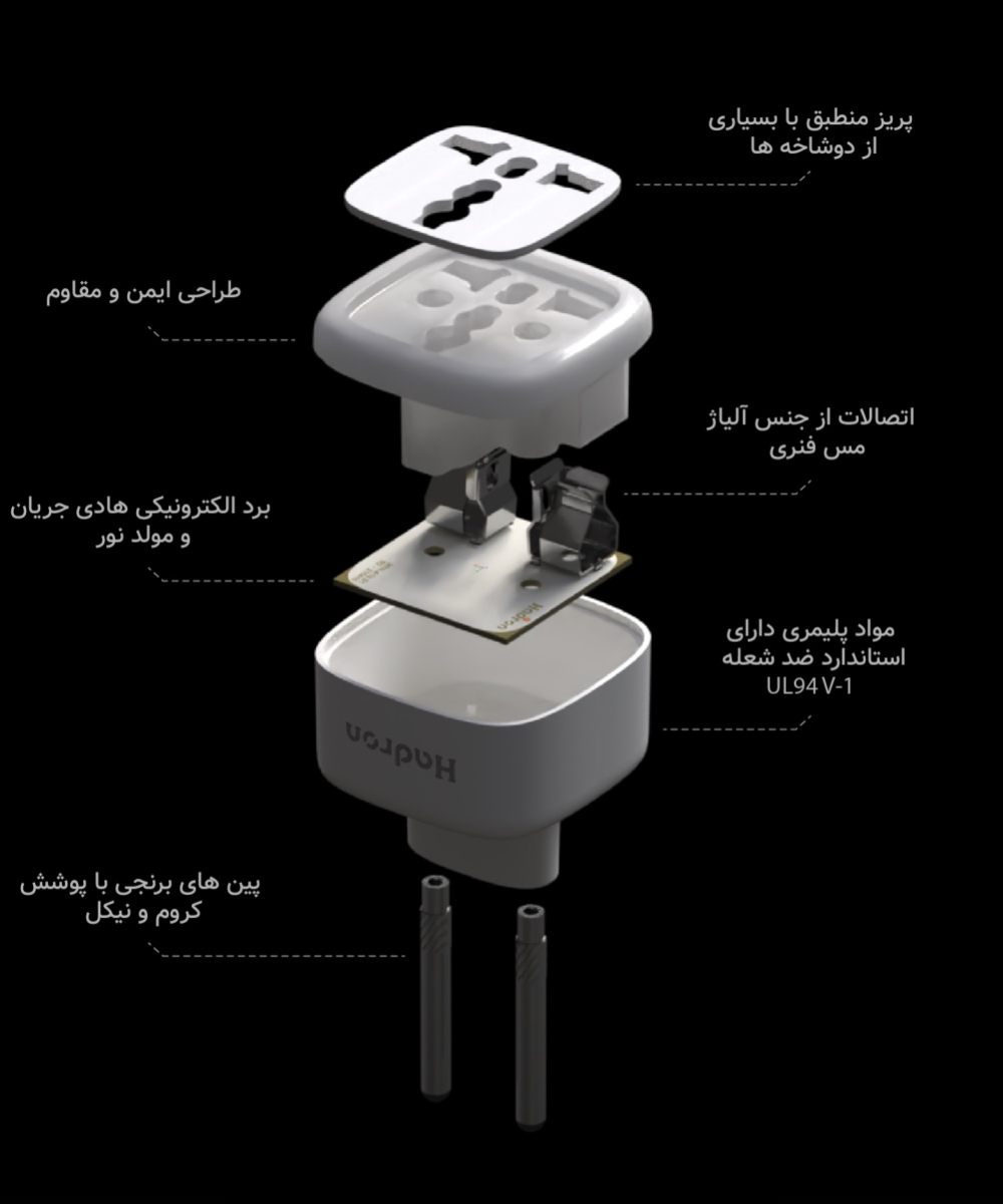 تبدیل دوشاخه برق هادرون مدل A10 وسیلهای جهت اتصال دستگاههایی با هر نوع دوشاخه برق به پریز ایرانی میباشد. زیبایی چشم نواز هم در روز و هم در شب بهواسطه نوار LED دور تا دور A10، استحکام در پریز و جلوگیری از لق زدن دوشاخه در مبدل به واسطه استفاده از متریال با کیفیت برنجی در پینها، همچنین بدنهی تولید شده از پلیکربنات مهندسی شده از ویژگیهای این محصول میباشند.